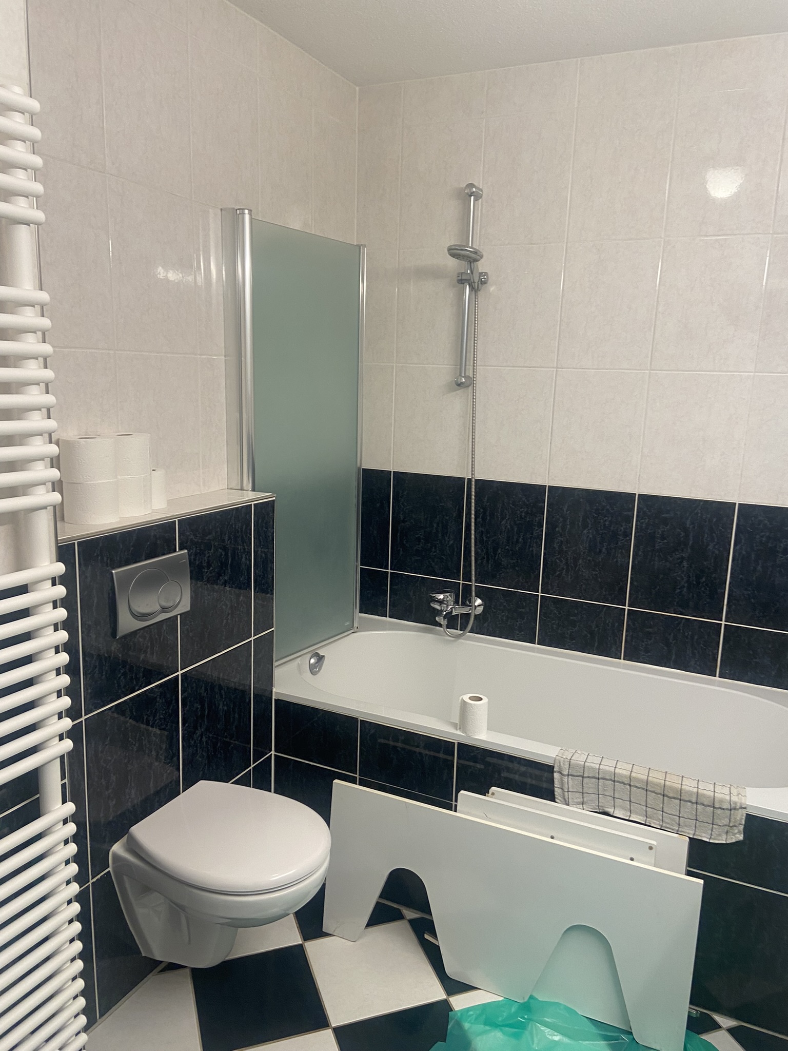 Deze badkamer is volledig vernieuwd met een strakke, moderne uitstraling. Van nieuwe tegels en sanitair tot optimale indeling en verlichting: elke hoek is met oog voor detail en comfort aangepakt.