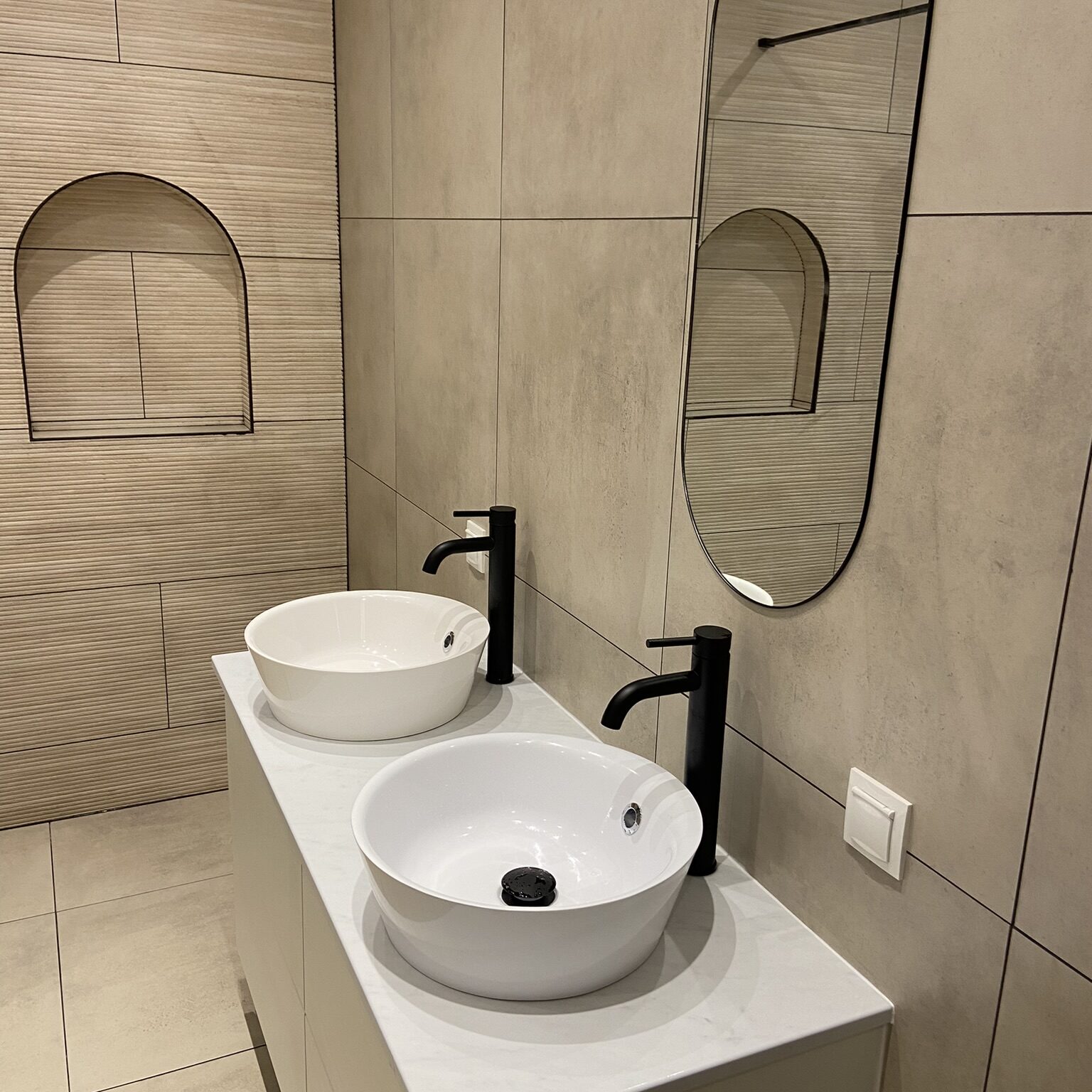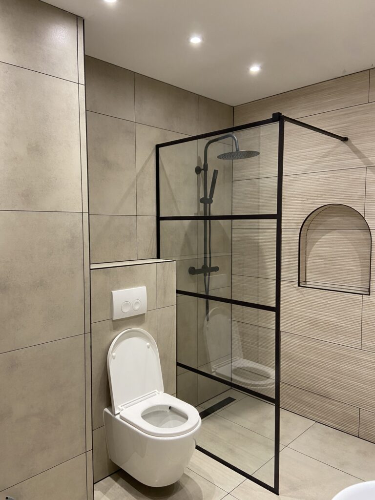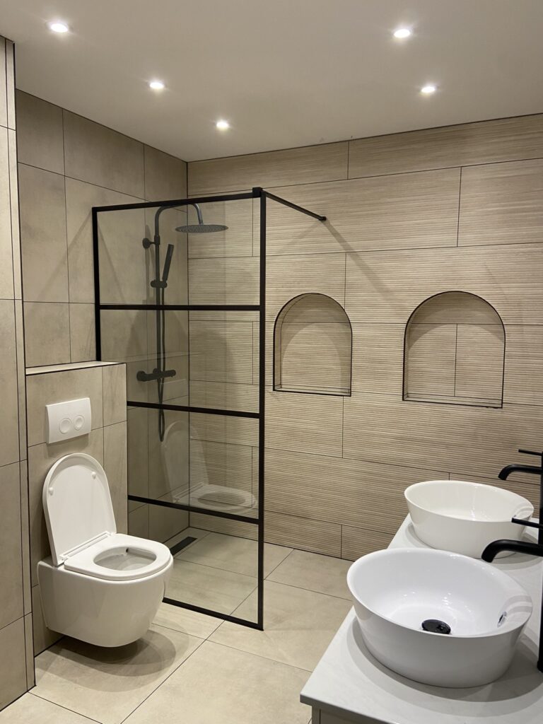 De oude badkamer is volledig gestript en opnieuw opgebouwd met moderne tegels, een ruime sta douche en een zwevend badkamermeubel. Door slimme verlichting en strakke afwerking oogt de ruimte nu groter en luxueuzer.