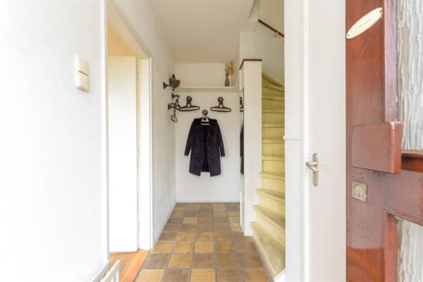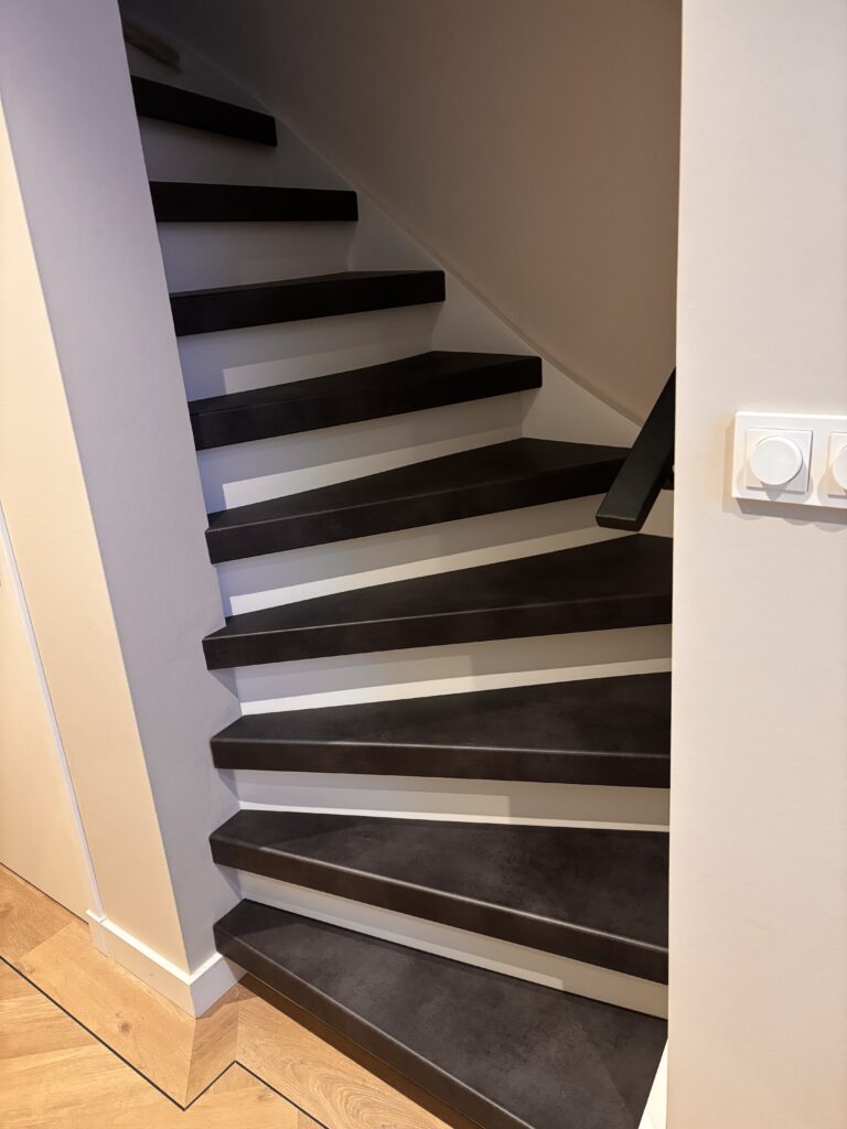 De trap is volledig gerenoveerd: oude treden zijn opnieuw bekleed, stootborden zijn vernieuwd en de balustrade is opnieuw geplaatst. De hal kreeg meteen een frisse, lichte uitstraling.