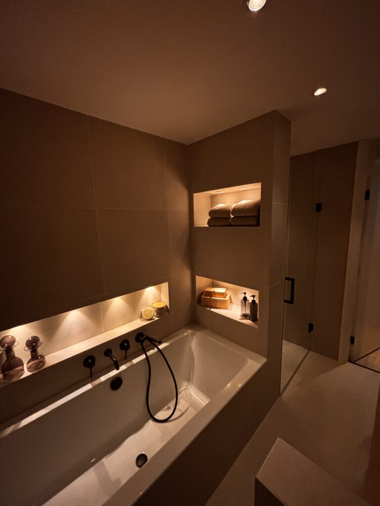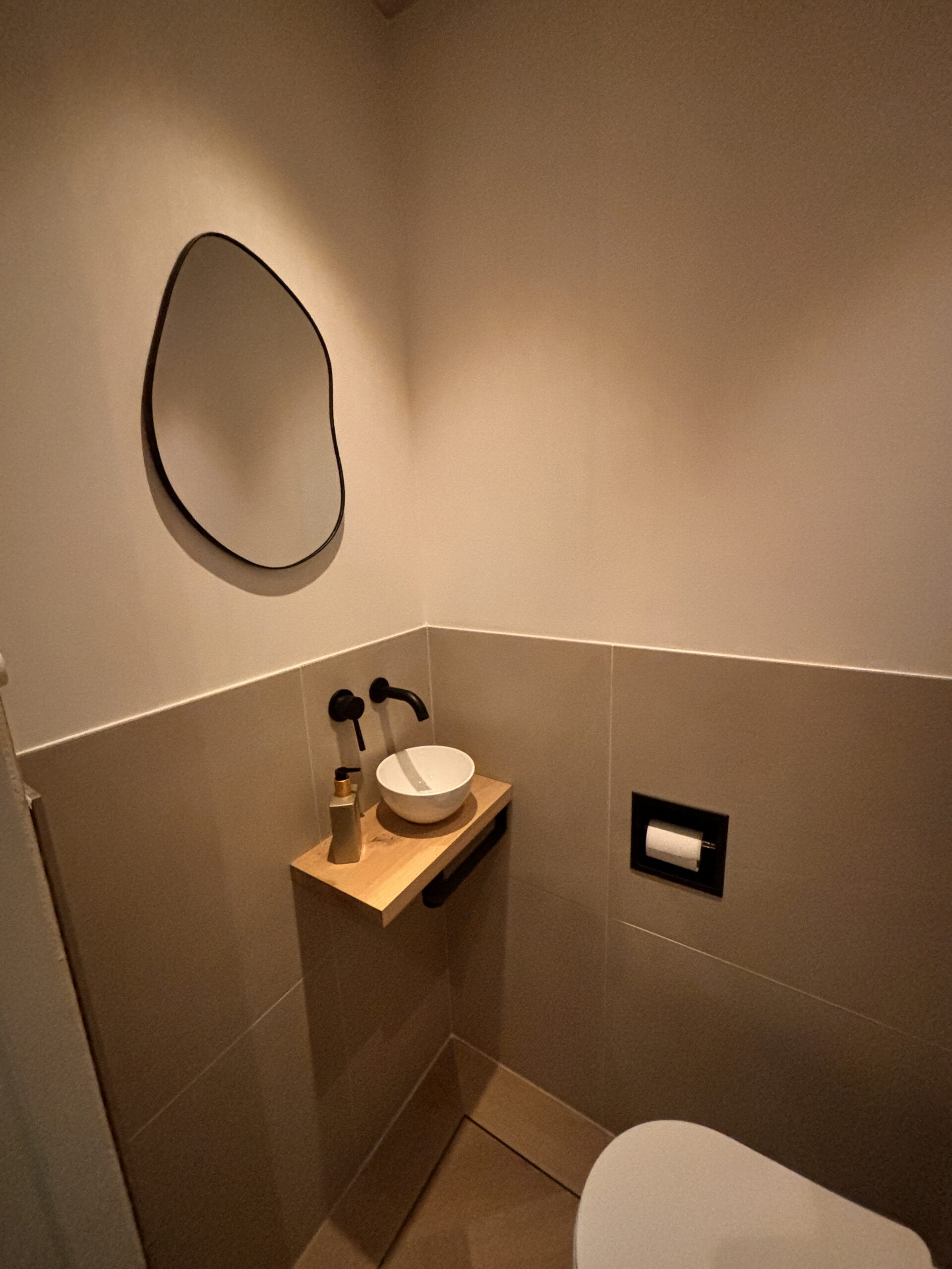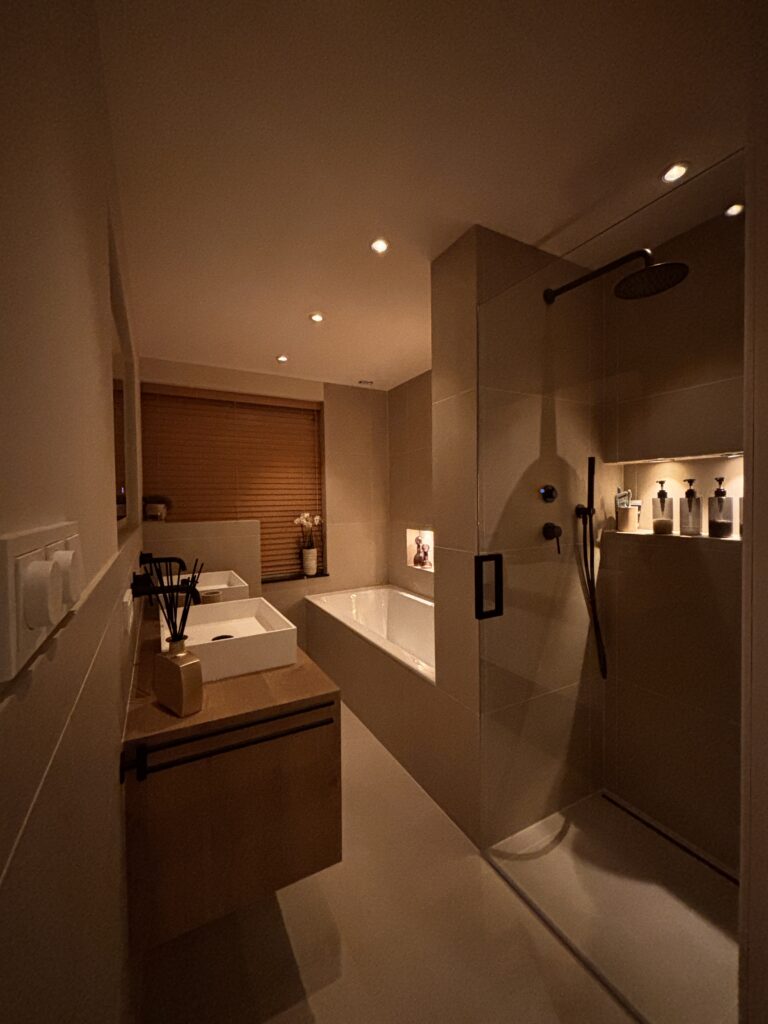 De oude badkamer is volledig gestript en opnieuw opgebouwd met moderne tegels, een ruime bad en een zwevend badkamermeubel. Door slimme verlichting en strakke afwerking oogt de ruimte nu groter en luxueuzer.