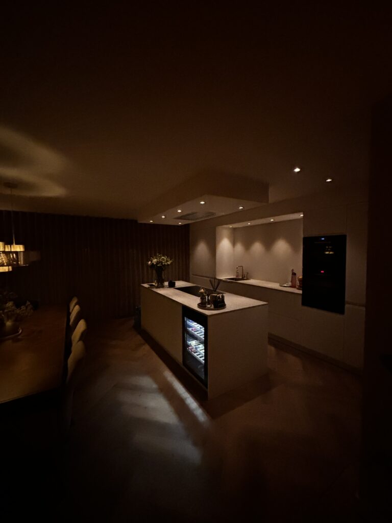 De bestaande keuken is vervangen door een maatwerkontwerp met nieuwe leidingen, moderne apparatuur en een praktische indeling. Dankzij warme materialen en strakke lijnen sluit de keuken nu perfect aan op de rest van het interieur.
