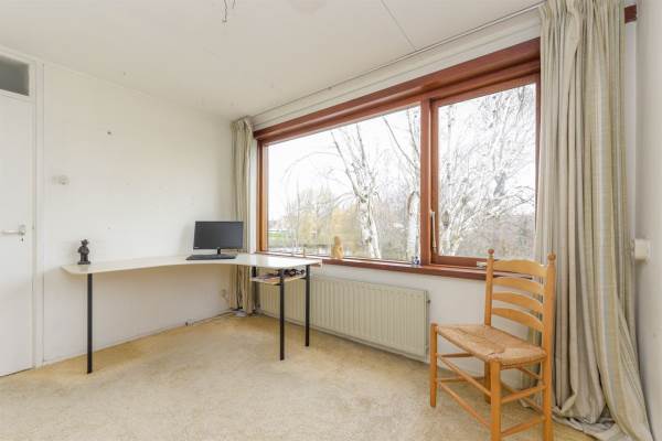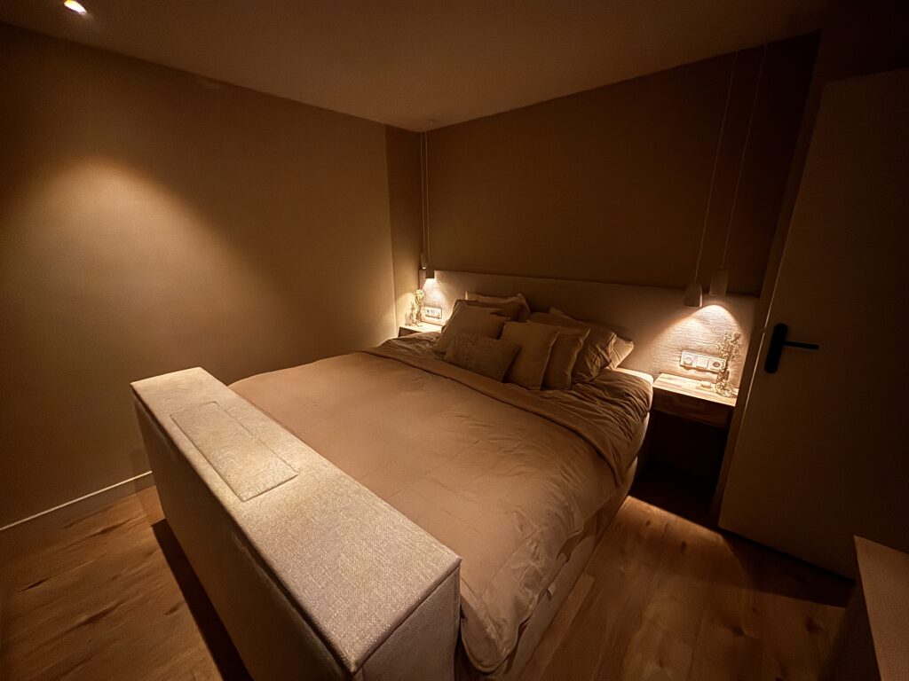 De slaapkamer is vernieuwd met glad gestuukte wanden, nieuwe vloerafwerking en op maat gemaakte kasten. Door een beter lichtplan en rustige kleuren is het een sfeervolle, comfortabele ruimte geworden.